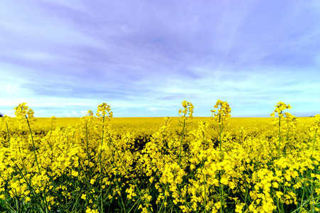 Rape field with bright yellow flowers under blue sky and white clouds on a spring sunny day