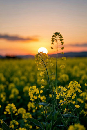Close up of a yellow rapeseed flower. In the background is a colorful sunset and an entire rapeseed field. Shallow depth of field.