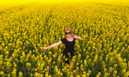 A girl in a black dress among the colors of rape in the field. Walk the girl among the yellow flowers. Flowering rape.