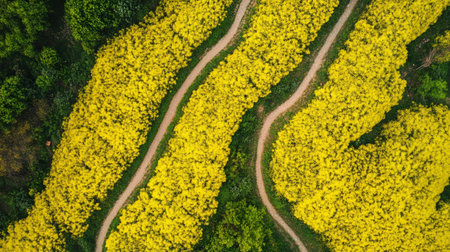 Flowering rapeseed. Country road across rape field. Spring background. Canola or colza with dirt road. blooming rape or Brassica napus. Springtime and summer border