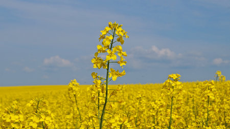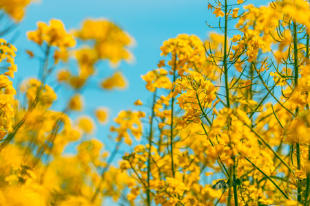 Detail of flowering rapeseed canola or colza field in rural british lands, plants for green energy and oil industry, rape seed flowering landscape with clear blue sky and blurry background