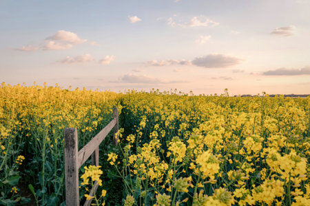 An expansive field of vibrant yellow flowers stretches towards the horizon, bordered by a rustic wooden fence under a soft, cloudy sky.