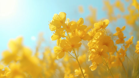 A stunning close-up of vibrant yellow flowers against a bright blue sky, embodying the beauty of nature during summer days in an idyllic field.