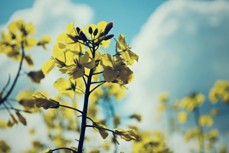 Closeup of yellow rapeseed canola flowers on field over clouds in sky
