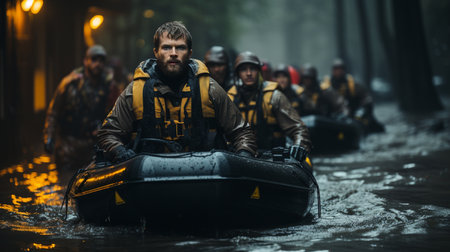 Rescuers search for people trapped in floods using rubber boat. Generative AI
