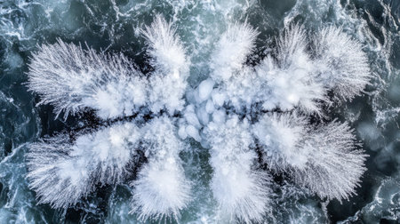 An impressive overhead shot that beautifully captures the dynamic and intricate patterns of ocean waves and their foam