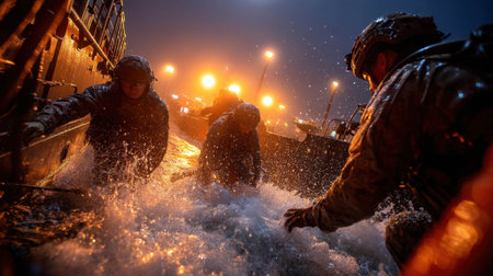 Three soldiers engage in maritime operations, battling waves and rough waters at night. Bright lights illuminate the scene, showcasing teamwork in a challenging environment.