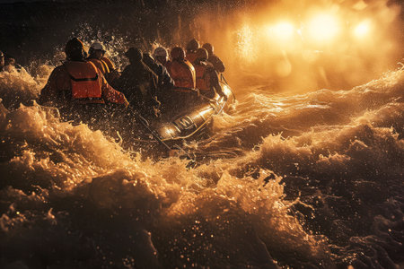 A group of refugees on a small boat faces rough seas and crashing waves. The scene symbolizes struggle, hope, and resilience in a journey for peace and safety.
