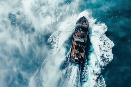 A dynamic aerial view of a vessel navigating through pristine ocean waters, creating vivid wakes as it forges ahead. The image highlights the interplay between machinery and the natural marine environment.