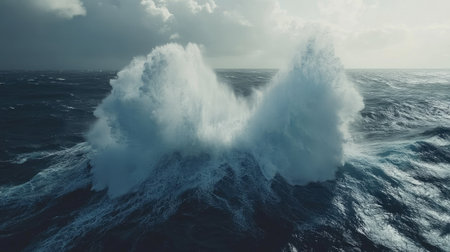 Big waves colliding in the middle of the ocean, with sprays of water shooting high into the air