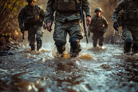 A group of soldiers carefully navigates a shallow, muddy stream at dawn, their gear glistening in the soft light. The atmosphere is intense as they focus on their mission in challenging terrain.