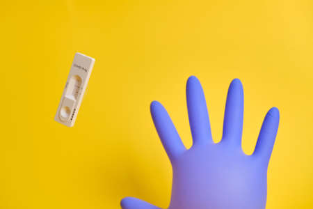 Gloved hand holding a negative rapid test device for COVID-19. Panoramic image with copy space.