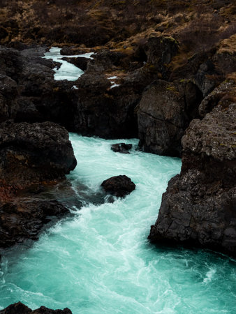 Barnafoss is a narrow, fast-flowing waterfall in Iceland, where glacial water rushes through rugged volcanic rock formations, creating striking blue rapids in a deep canyon