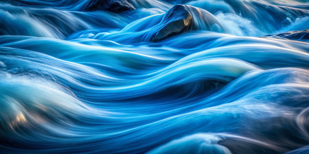 Vibrant blue streams cascade swiftly over rugged rocks, creating lively splashes that emphasize movement and vitality within a pristine, natural setting.