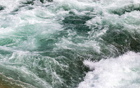 Nature background of dark water stream of mountain river with rapids. Full frame of sea surf. Natural textured backdrop of ocean surf. Texture of tide close-up. Dark water surface of mountain creek.