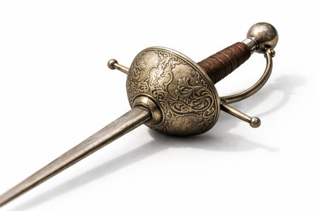 minimalist depiction of a fencing epee laid flat on a white surface emphasizes its elegant blade and guard illuminated by bright studio lighting that creates soft shadows.