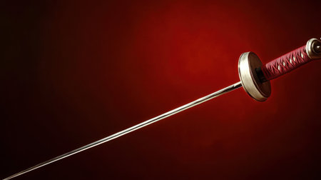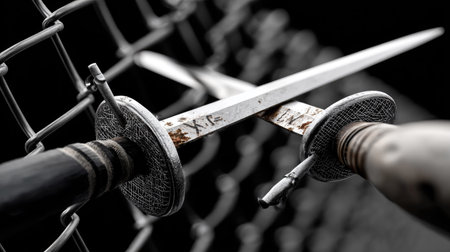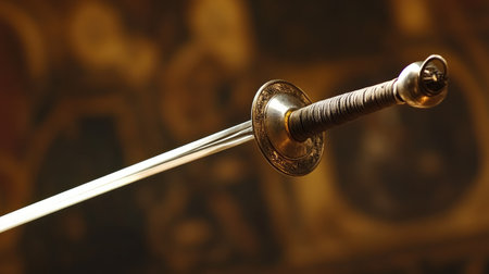 A dynamic shot of a fencing sword mid-air, captured in perfect balance.