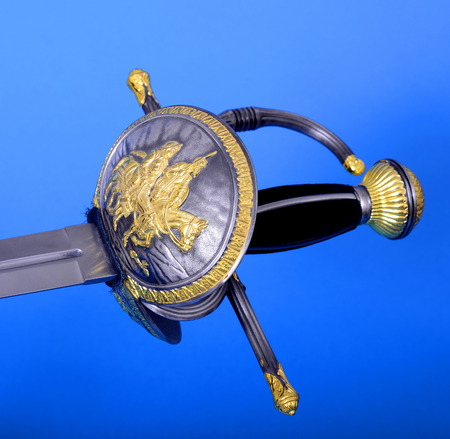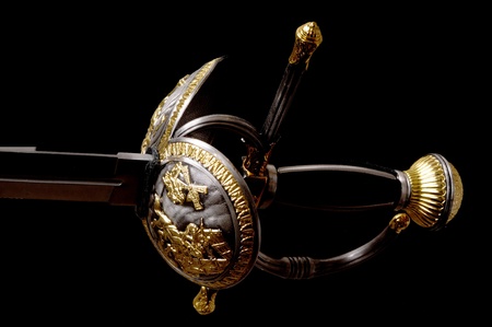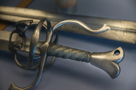 foreground in vertical view of hilt of a cup rapier sword from the 16th and 17th centuries. exhibition of ancient swords