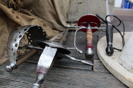 Medieval weapons on a wooden table for any purpose