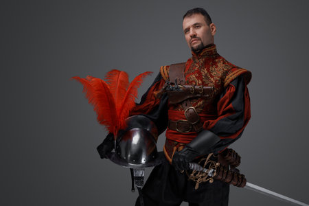 Stylish musketeer duelist holding helmet against grey background