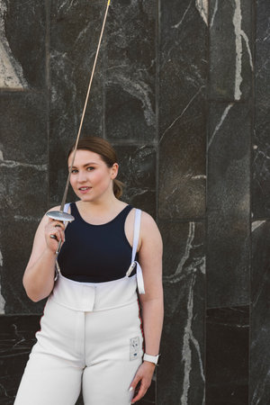 Female Fencer athlete wearing white fencing suit outfit and holding the sword, posing outdoors