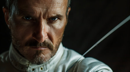 In a dramatic interplay of light and shadow, a fencer stands en garde, poised and focused, ready for the bout to commence.