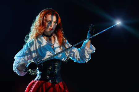 Portrait of a beautiful red-haired girl with a glittering battle epee (rapier) in light and shadow on a black background. Historical reconstruction of the 16-17th centuries.