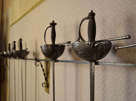 Stored sabers and swords hanging on the wall for display