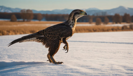 A stunning aerial view of a majestic bird of prey soaring through a serene winter landscape, showcasing its detailed feathers against a tranquil backdrop.