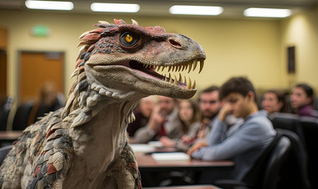 A dinosaur statue is displayed in front of a crowded classroom filled with people.