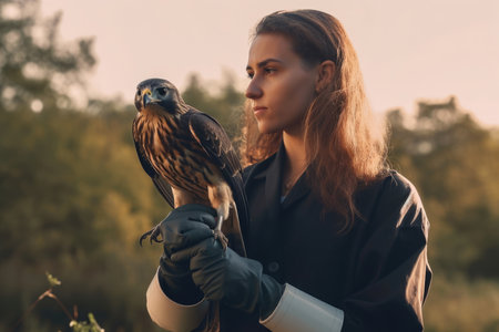 Passionate veterinarian holding a bird of prey and standing in front of a beautiful natural landscape, wearing a protective glove and a specialized equipment