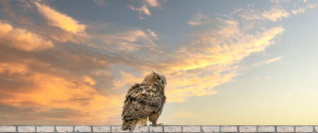 Panorama of an Eagle Owl. Sit on the ridge of a wall. Bird looks back, the red eyes stare at you. Beautiful dramatic blue and yellow sky with clouds in the background. Composite photo. Cover, social media or web banner.