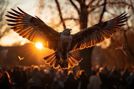 Eagle flies high against the backdrop of a sunrise, representing national identity in ancient Rome and Native American culture.