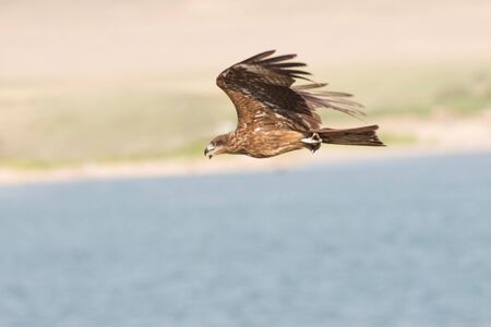 The bird of prey Black Kite flying in blue Sky. The black kite, Milvus migrans, is a medium-sized bird of prey.