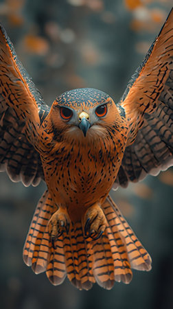 A stunning bird of prey captures attention in mid-flight against a backdrop of colorful autumn foliage, showcasing the beauty of nature and wildlife.