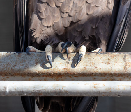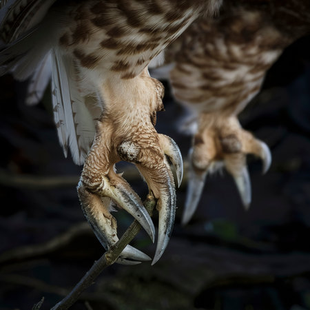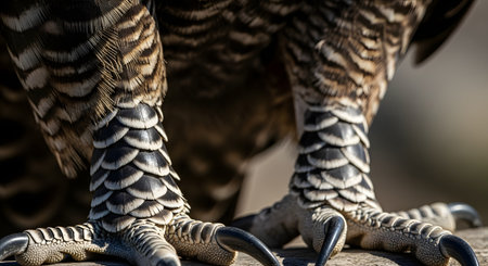 An extreme close-up, macro photograph focusing on the powerful and sharp talons of a large bird of prey, such as an eagle or hawk. The image reveals the intricate, armor-like texture of the scales on its feet and the formidable size of its claws. This detailed shot captures the raw strength and predatory nature of the magnificent animal.