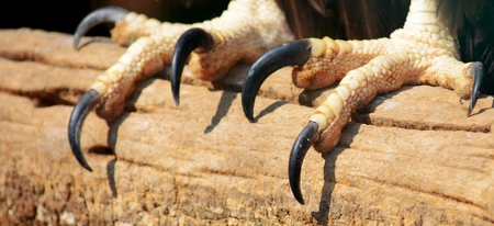 A bird with black claws is perched on a wooden post. The claws are sharp and pointy.