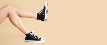Beautiful sneakers on woman legs in studio on white background. Fashionable shooting of a young girl with beautiful legs