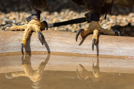 Falconry. Bald eagle talons with falconers leather jesses. Close up of bird of prey feet on water bowl with reflection.