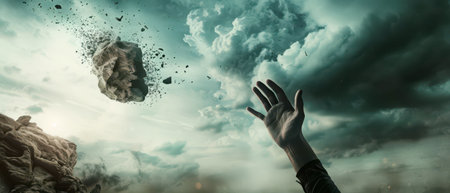 A lone hand reaches towards the sky as a large, rocky mass falls from a cloudy sky. The sky is filled with stormy gray clouds and the rock is breaking apart, leaving a trail of debris. The hand appears small and vulnerable against the vastness of the sky and the falling rock.