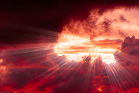 Dramatic sunset sky with clouds and rays of light. Toned.