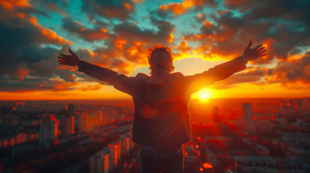 Young man with arms outstretched enjoying the sunset over the city.