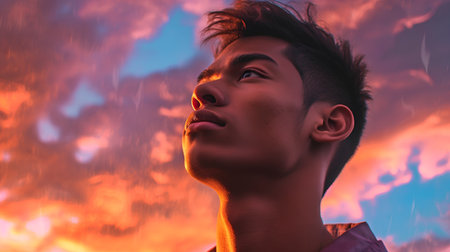 Young asian man looking up at the sky with dramatic clouds.