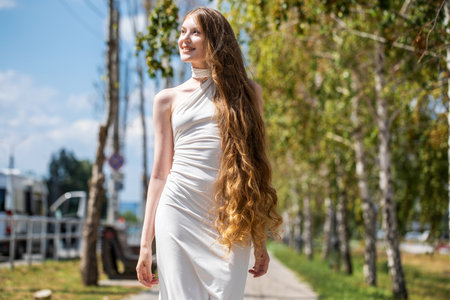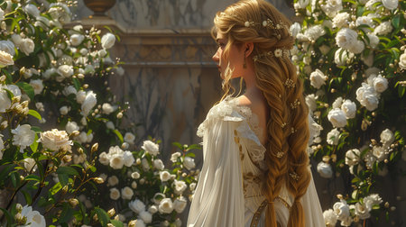 Blonde woman in traditional attire standing amid lush greenery, grasping flowing hair while savoring summer garden landscape