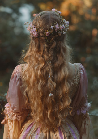 A young girl stands with her back to the viewer, showcasing her long, curly hair decorated with small flowers. She is dressed in a soft pink gown, surrounded by a whimsical indoor decor.