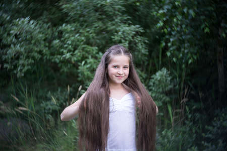 Portrait of a beautiful girl with long hair in nature.