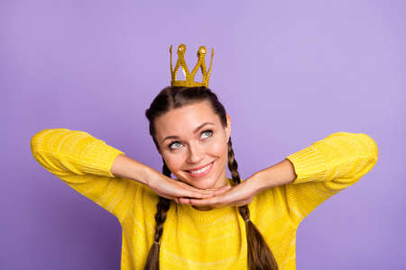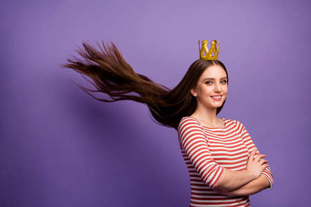 Portrait of positive cheerful smart high school girl crossing her hands proud of her prom party win gold crown haircut fly throw wear white sweater isolated over purple color background
