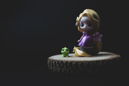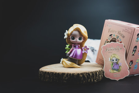 Bangkok, Thailand - July 29, 2023 : Cote a Rapunzel Raiponce, Disney fairy town figure blind box from Miniso shop. on a black background