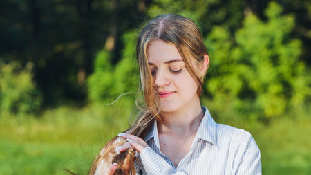 portrait of beautiful girl braiding braid against the background of green trees in countryside. Close-up