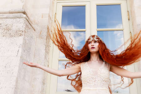 The red-haired girl throws your gorgeous hair. Bride in wedding day